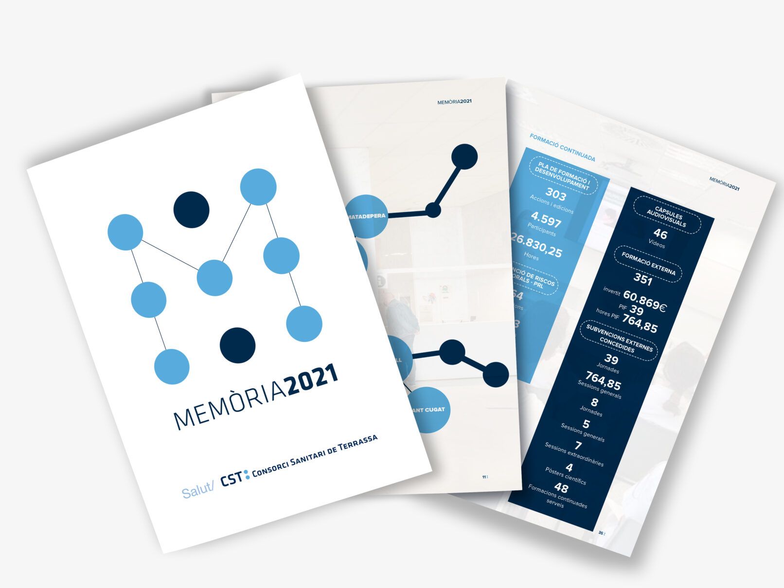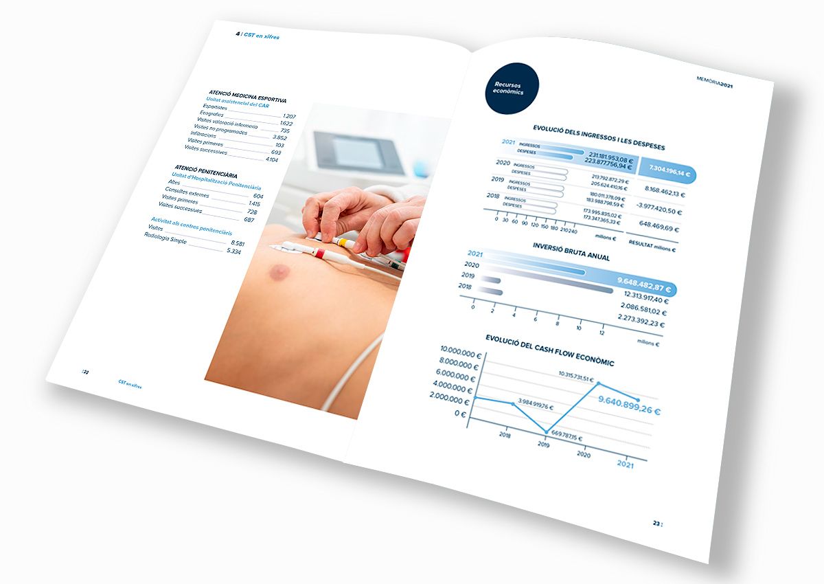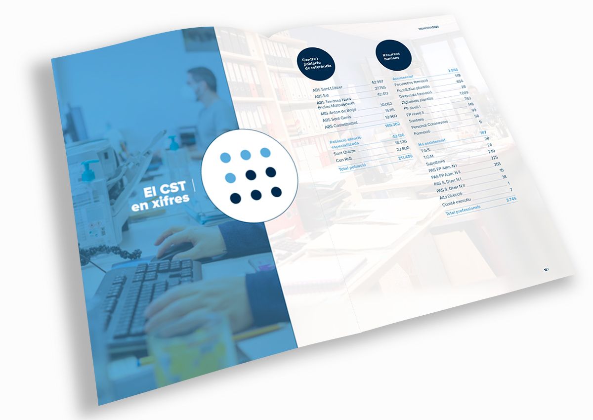 Disseny gràfic i maquetació de la memòria corporativa del CST. Resum de les dades, xifres i activitats més significatives de l’institució al llarg de cada any.